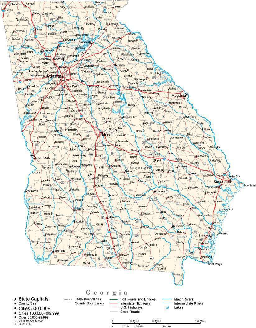 Georgia with Capital, Counties, Cities, Roads, Rivers & Lakes
